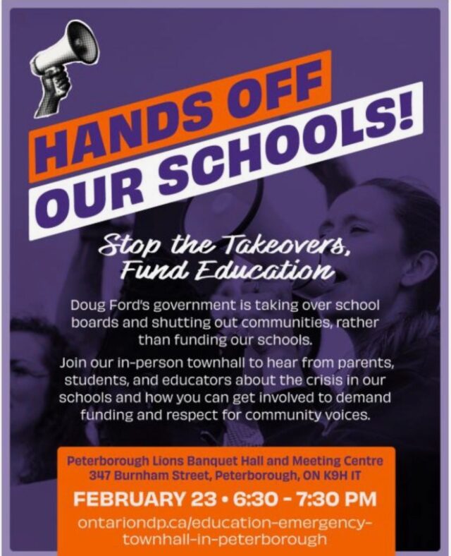 There is a Hands Off Our Schools Education Town Hall meeting in Peterborough on Monday February 23rd.